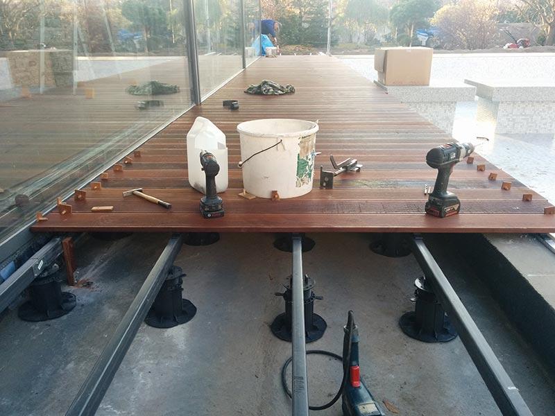 Dzięki zastosowaniu takiego rozwiązania mogliśmy dopasować się do stopni, które również pełnią funkcję siedzisk. Wsporniki poziomujące firmy DDPedestals pozwoliły nam na dopasowanie się poziomem do przygotowanych wcześniej balustrad, które montowane są do podłoża za pomocą dużych, solidnych kotew i dzięki systemowi tarasu wentylowanego można było je bez problemowo pokryć deskami okładziny.